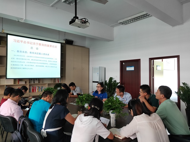 陈颖首先做了主题发言,带领大家学习了《习近平总书记关于教育的重要论述》原著以及陈宝生部长对习近平总书记关于教育的重要论述的评价;并结合学院工作实际,从“如何打造稳定的创新研究教师队伍?”、“如何开创教学科研并重之工作局面?”两个方面谈了如何建设学院教师队伍;从学院青年人才培养、学科建设抓手等方面明确了学院人才工作定位;强调要做好精细化管理,夯实队伍能力;建议实现教师教学分类管理。