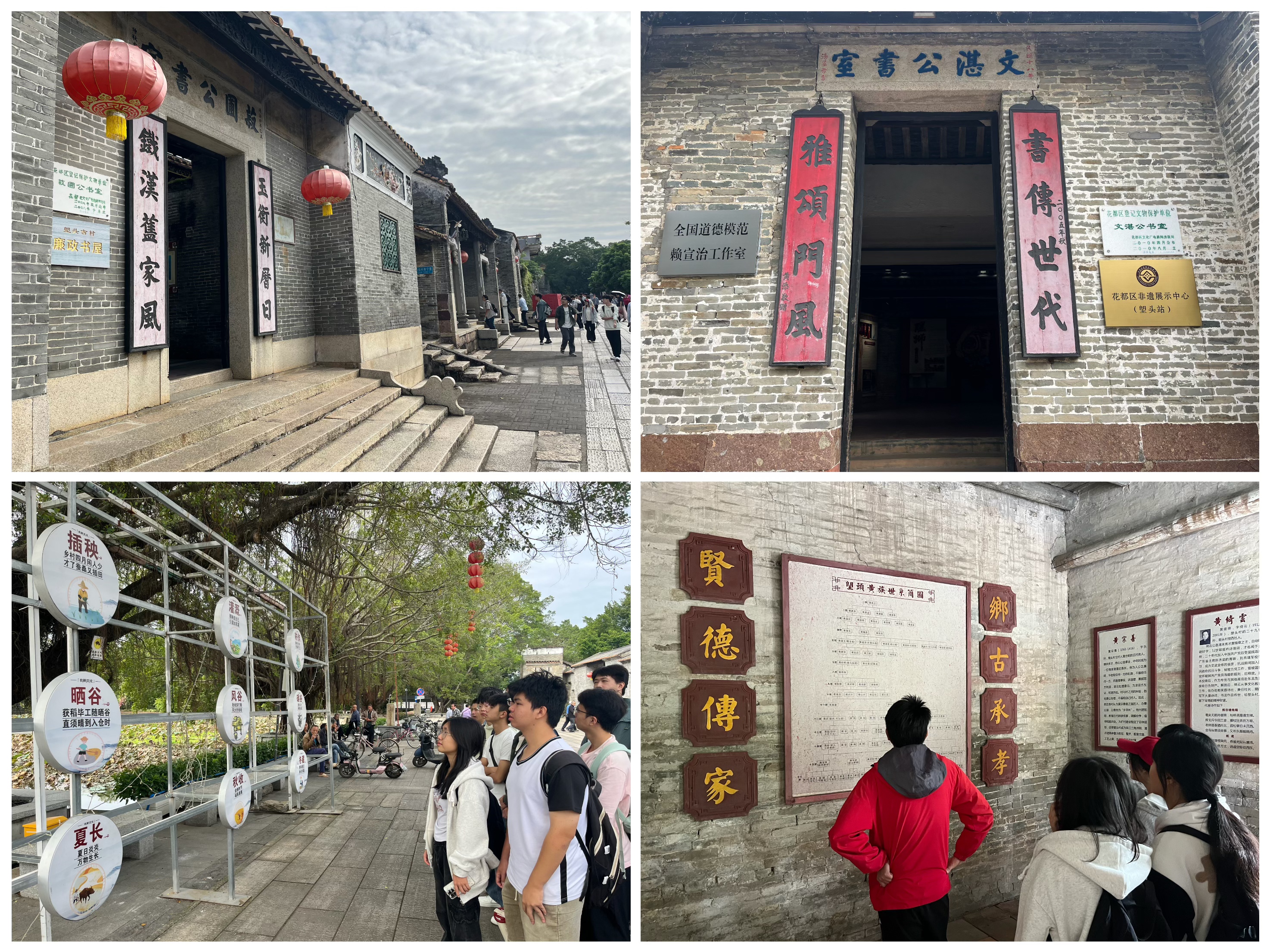 同学们先后走访了塱头古村历史陈列馆、黄氏祖祠与谷诒书室等核心文化地标,探寻文化赋能乡村振兴的生动实践。村史陈列馆的详实史料与农耕器械串联起古村700余年“耕读传家”的文脉,黄氏祖祠以“修旧如旧”的匠心留存岭南古建精髓,谷诒书室昔日文风鼎盛,如今升级为文化体验空间,让传统教育文化与现代研学、文旅体验相结合。