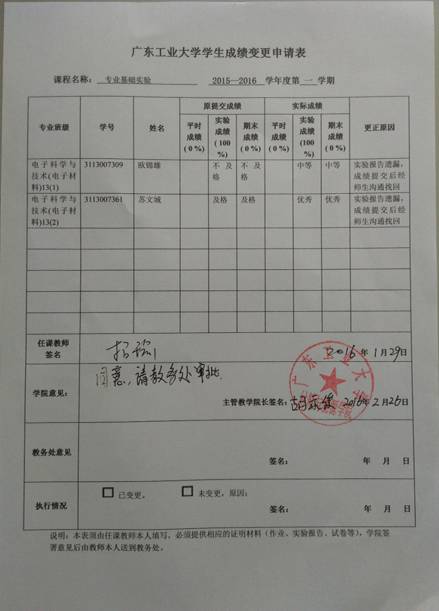 根据《广东工业大学理论课程考核管理办法》(广工大教字【2007】15号)文件之相关规定,现就bw必威西汉姆联官方网站开设的《专业基础实验》(2015-2016-1学期)学生成绩变更事项予以公示。 公示时间:2016年3月1日至2016年3月8日 如有异议,请署名书面反映到学院教务办公室,不接受匿名投诉。 电话:39322571