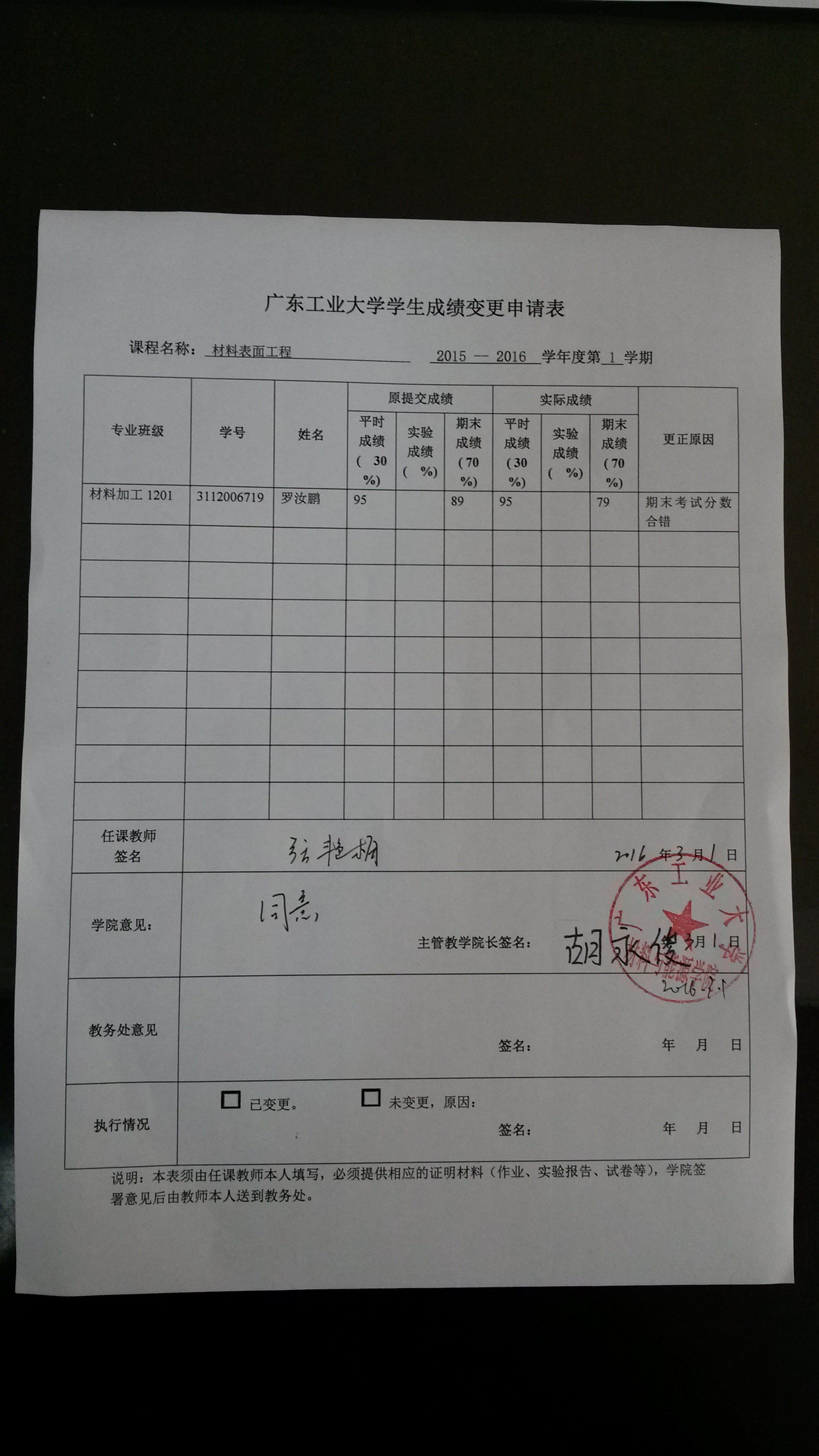 各位老师: 根据《广东工业大学理论课程考核管理办法》(广工大教字【2007】15号)文件之相关规定,现就bw必威西汉姆联官方网站开设的《材料表面工程》(2015-2016-1学期)学生成绩变更事项予以公示。 公示时间:2016年3月2日至2016年3月9日 如有异议,请署名书面反映到学院教务办公室,不接受匿名投诉。 电话:39322571