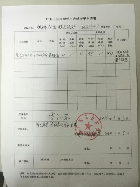 根据《广东工业大学理论课程考核管理办法》(广工大教字【2007】15号)文件之相关规定,现就bw必威西汉姆联官方网站开设的《塑料成型模具设计》(2015-2016-1学期)学生成绩变更事项予以公示。 公示时间:2017年1月5日至2017年1月11日 如有异议,请署名书面反映到学院教务办公室,不接受匿名投诉。