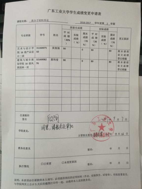 根据《广东工业大学理论课程考核管理办法》(广工大教字【2007】15号)文件的相关规定,现就bw必威西汉姆联官方网站开设的《高分子材料导论》(2016-2017-2学期)学生成绩变更事项予以公示。 公示时间:2017年9月14日至2017年9月18日 如有异议,请署名书面反映到学院教务办公室,不接受匿名投诉。