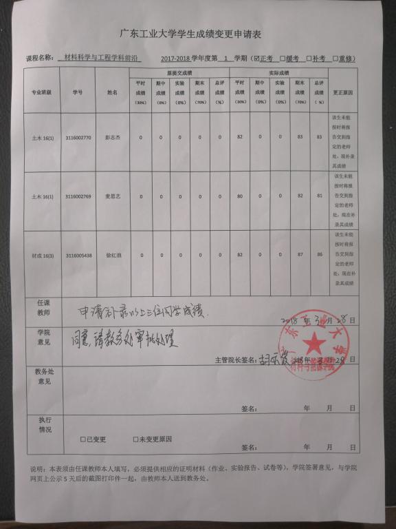 根据《广东工业大学理论课程考核管理办法》(广工大教字【2007】15号)文件的相关规定,现就bw必威西汉姆联官方网站开设的《材料科学与工程学科前沿》(2017-2018-1学期)学生成绩变更事项予以公示。 公示时间:2018年3月28日至2018年4月2日 如有异议,请署名书面反映到学院教务办公室,不接受匿名投诉。