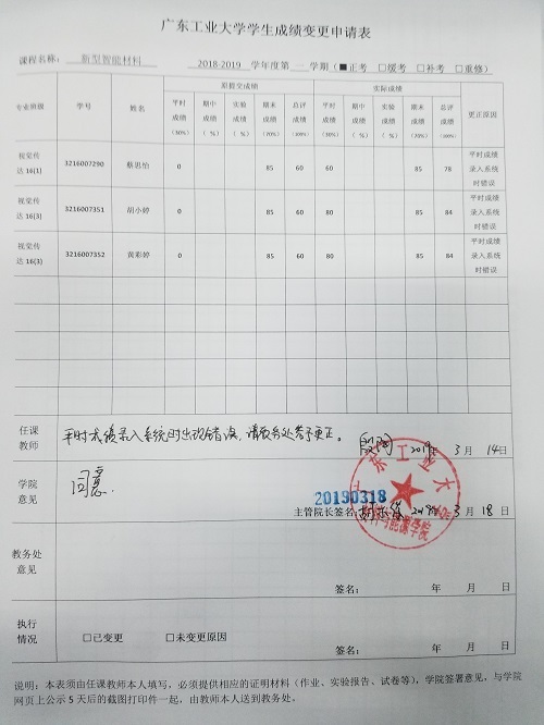 根据《广东工业大学理论课程考核管理办法》(广工大教字【2007】15号)文件的相关规定,现就bw必威西汉姆联官方网站开设的《新型智能材料》(2018-2019-1学期)学生成绩变更事项予以公示。