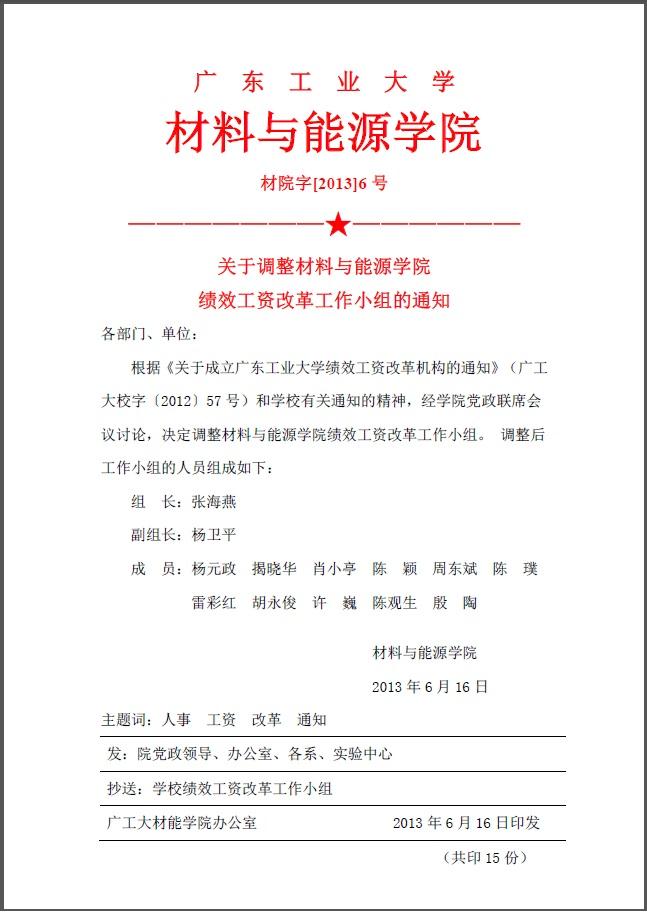 院字2013年6号(关于调整材料与能源学院绩效工资改革工作小组的通知)