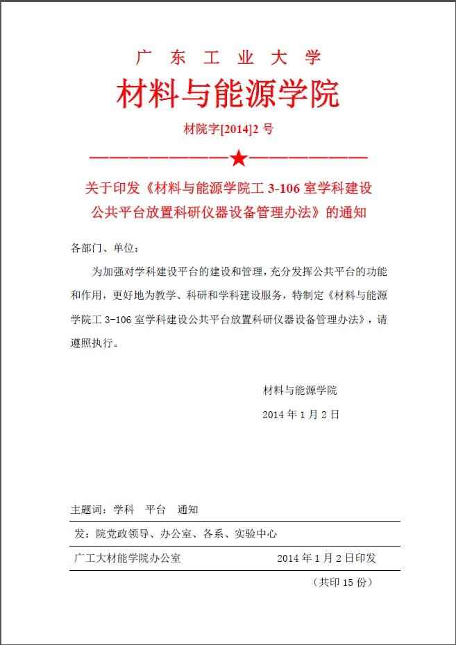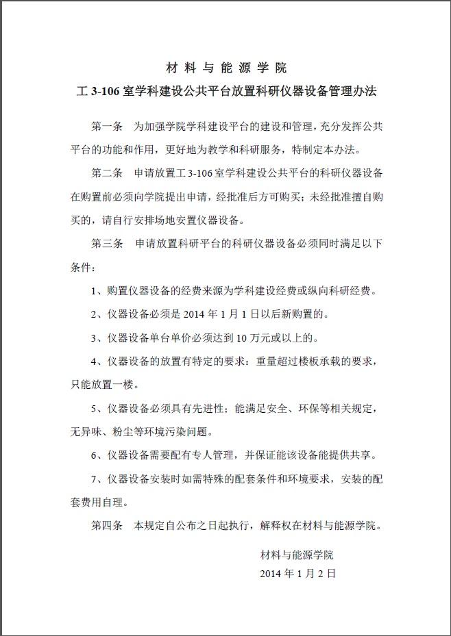 院字2014年2号 (关于印发《材料与能源学院公共平台放置科研仪器设备管理办法》的通知)