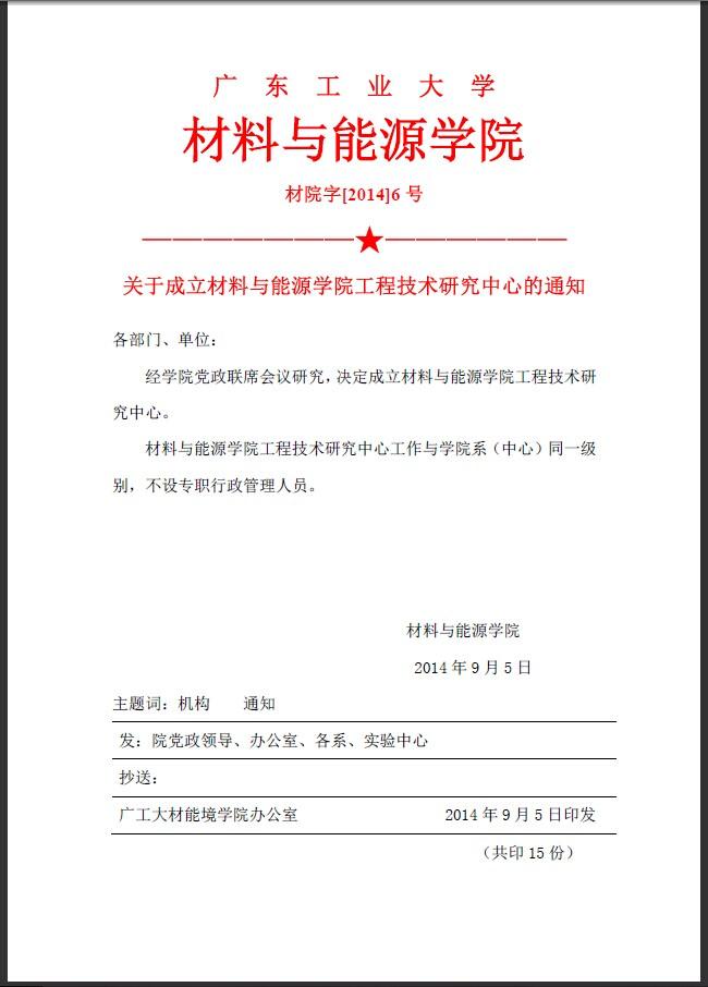 院字2014年6号(关于成立材料与能源学院工程技术研究中心的通知)