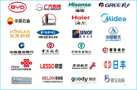 著名企业包括:比亚迪集团股份有限公司、中国石油股份有限公司、中国石化股份有限公司、广州汽车集团股份有限公司、中国航天科技集团公司、中国电器科学研究院有限公司、佛山市顺德万和电气配件有限公司、中国银行股份有限公司、联塑集团股份有限公司、广州立白企业集团有限公司、广东美的厨房电器制造有限公司、欣旺达电子股份有限公司、金发科技股份有限公司、广东海信电子有限公司、菱王电梯股份有限公司、佛山海尔滚筒洗衣机有限公司等。