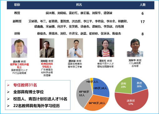 本专业隶属bw必威西汉姆联官方网站,是广东省高水平大学建设重点建设学院。材料科学与工程一级学科是广东省“211工程”三期重点建设学科、广东省攀峰重点学科、广东省高等教育“冲补强”提升计划重点建设学科。教育部第四轮学科评估获得B-等次。材料学科于2017年7月进入ESI排名前1%。专业依托的高分子材料与工程二级学科是一级学科下设重点建设学科。现有专任教师32名,其中教授10名(含国家级高层次人才1名、其中:国家杰青/广东省科技创新领军人才1位、广东省青年珠江学者1位),副教授(含其它副高级职称)19名,具有博士学位的教师31名,占专任教师比例96.9%。