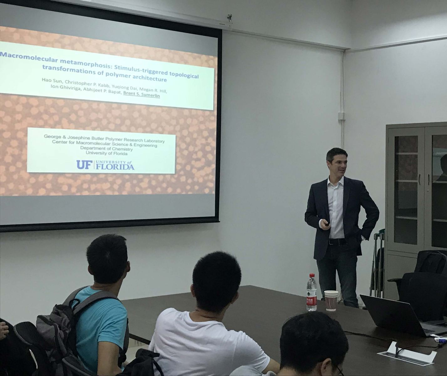 讲座中,Brent Sumerlin教授介绍了自己团队最新的研究方向和动态。Brent Sumerlin教授主要聚焦于功能化聚合物的合成与聚合物有效改性修饰、水溶性刺激响应型嵌段聚合物、动态共价化学高分子材料以及智能聚合物-蛋白质生物轭合物的合成等方面,其发表的论文超过250篇,部分成果也发表在 《JACS》、《Nature materials》、《Chemical Society Reviews》、《Macromolecules》等高水平期刊上。而本次讲座主要讲述采用单一紫外光辐照三硫酯类化合物在乙烯基的存在下合成具有超高分子量的规则聚合物的新方法,并谈到了本次讲座主题内容的广阔研究前景。随后,老师和学生们都踊跃提问了相关的感兴趣的问题,Brent Sumerlin教授也认真地和师生们作了问题探讨。