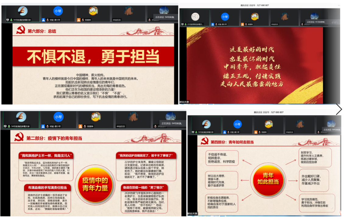 活动共包含三个环节:一是入党积极分子在会前以小组的形式针对“疫情之下中国青年的责任与担当?”、“青年学生如何以实际行动争取加入中国共产党?”两个议题进行线上学习研讨,碰撞思维的火花。第二个环节为各个小组在会上以PPT的形式依次汇报学习研讨成果,并提出在学习研讨过程中遇到的问题。第三个环节为各党支部委员、老师与入党积极分子进行互动交流、做好答疑和总结,各党支部在此环节对“如何树立正确的入党动机”做了专题分享,提出了对入党积极分子的要求、建议并回应入党积极分子提出的疑问,并通过此次活动建立了入党积极分子培养教育管理的长效机制。同时杨小帆副书记、谭小琴和刘烨老师在会上与入党积极分子进行了深入的互动交流,并给提出了希望和建议。