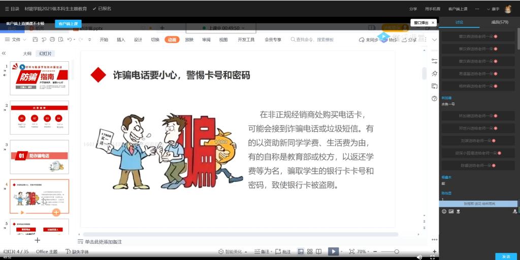 8月28日,迎新报道当天,bw必威西汉姆联官方网站向新生发放防诈宣传提示,并在走访宿舍中进行防诈宣传。8月30日上午,bw必威西汉姆联官方网站在线召开防诈骗培训,学院康宇老师从诈骗电话、钓鱼网站、校园贷等几个方面介绍了常见校园诈骗手法,并详细介绍校园十大诈骗类型,通过案例详细分析了主要诈骗手法及防范要点,帮助同学们提高防骗意识。最后,康宇老师督促各班在班会课等活动中,按照反诈宣传“七个一律”要求,加入防诈骗教育主题,切实提高同学们反诈防骗意识。