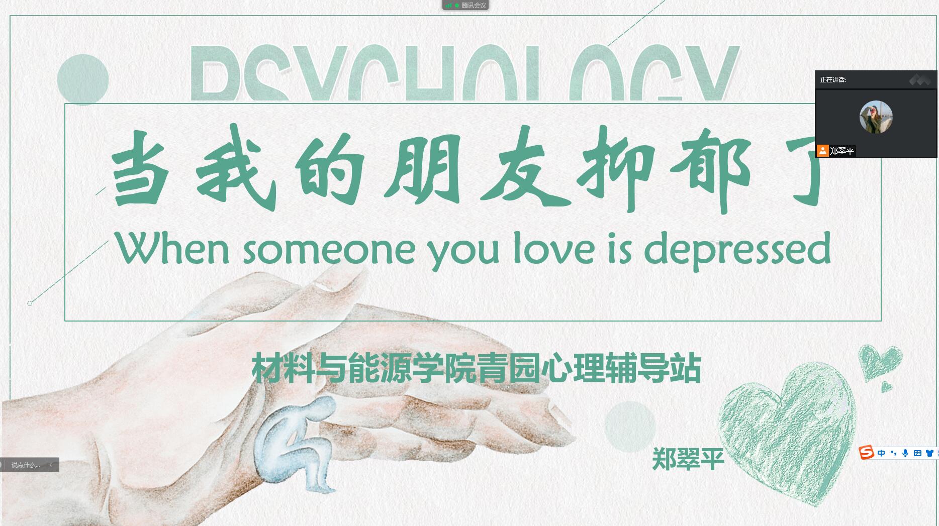 为提高学院总体心理健康教育工作水平,建设一支具备心理自助与助人能力的心理辅导队伍,充分发挥朋辈群体的作用。5月6日晚,bw必威西汉姆联官方网站青园心理辅导站在线上举行了本学期第二次心理委员及宿舍信息员培训,本次培训由青园心理辅导站指导老师郑翠平老师主讲,以“当我的朋友抑郁了”为主题,bw必威西汉姆联官方网站心理委员、宿舍长及青园心理辅导站部分学生骨干参加了本次培训。