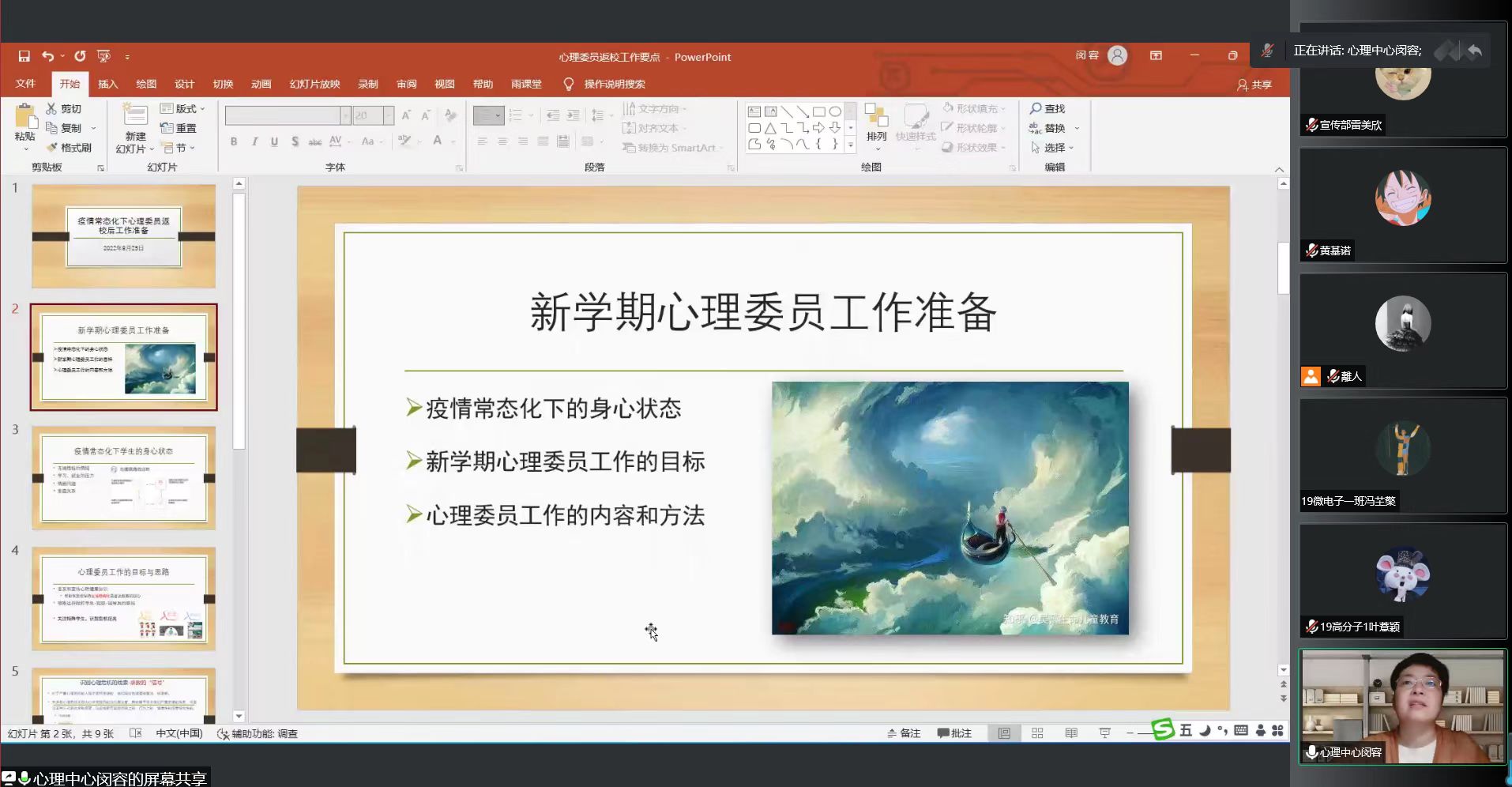 会上,闵容老师以“新学期心理委员工作准备”为主题,围绕疫情常态化下的身心状态、新学期心理委员工作的目标和方法等方面为心委们进行了讲解,指导心理委员识别危机征兆,关注身边同学。随后,郑翠平老师对如何适应新学期的生活、学习、人际方面的变化提出了针对性的方法。郑翠平老师指出,新学期心委们需要端正心态,调整自身情绪,做到助人助己,帮助同学们快速度过新学期的不适期。