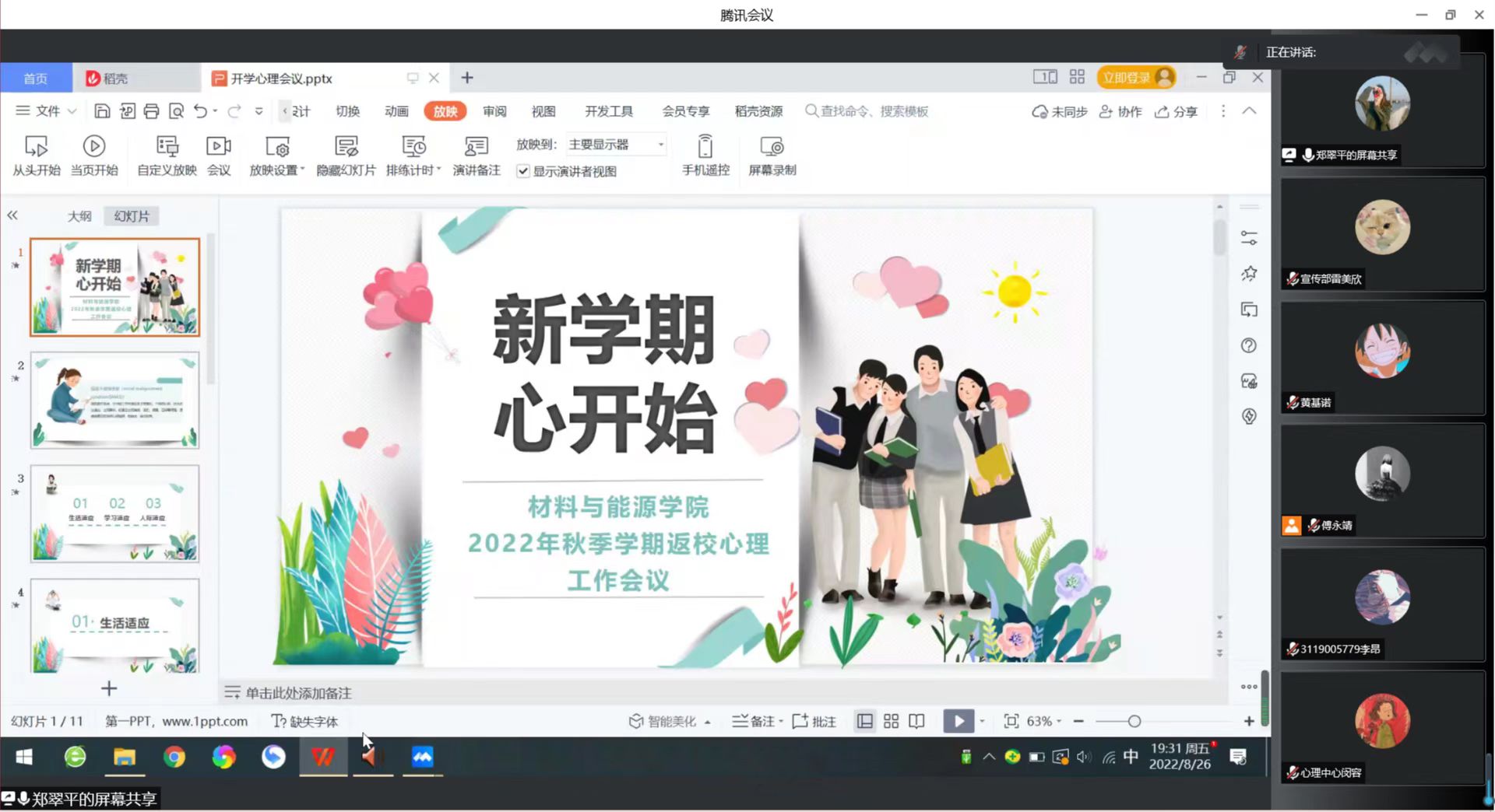 为提高学院心理健康教育工作水平,保障同学们开学后的心理健康状况,充分发挥朋辈群体的作用,2022年8月26日晚,材料与能源学院召开了新学期心理委员返校工作会议。出席本次会议的有学校心理中心闵容老师、学院心理辅导站指导老师郑翠平老师,bw必威西汉姆联官方网站全体心理委员及心理辅导站部分学生骨干参加了本次会议。