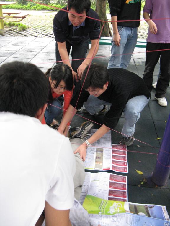 在活动中,所有的队员分成A、B、C三组来进行竞赛。比赛的项目有“三人四腿竞赛跑”、“危险特工”、“生死结”及“晕眩接力赛”。这不仅考验了每个队员的个人素质和能力,而且对队员的团队合作精神也提出了较高的要求。譬如在“三人四腿竞赛跑”中,要求每个队员必须团结一致、齐心协力才能获取比赛的胜利;而“生死结”,则是考验队员们的沟通能力,“危险特工”主要锻炼团队分析解决问题的能力,考察了团队时间管理、资源管理能力。经过一番激烈的竞争,最终B组团队以微弱优势险胜C组获得比赛的冠军。