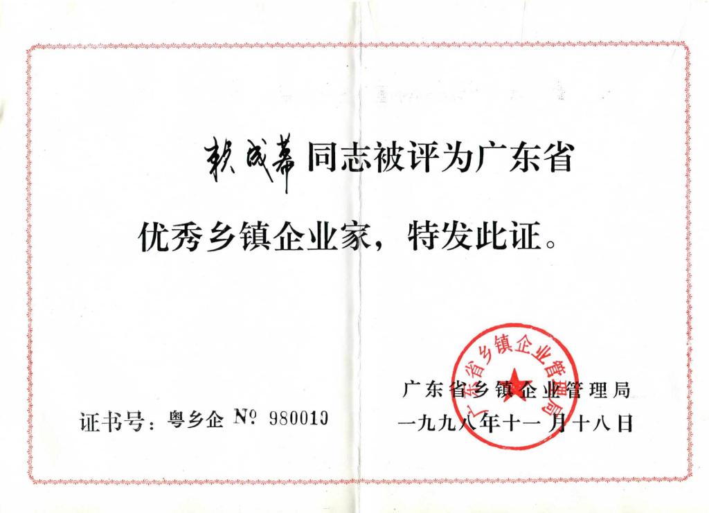 赖成幕先生获“广东省优秀乡镇企业家”称号
