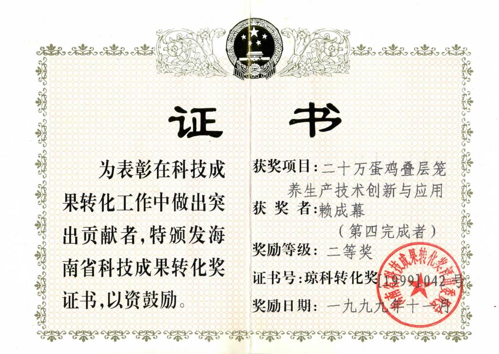 赖成幕先生获海南省科技成果转化二等奖