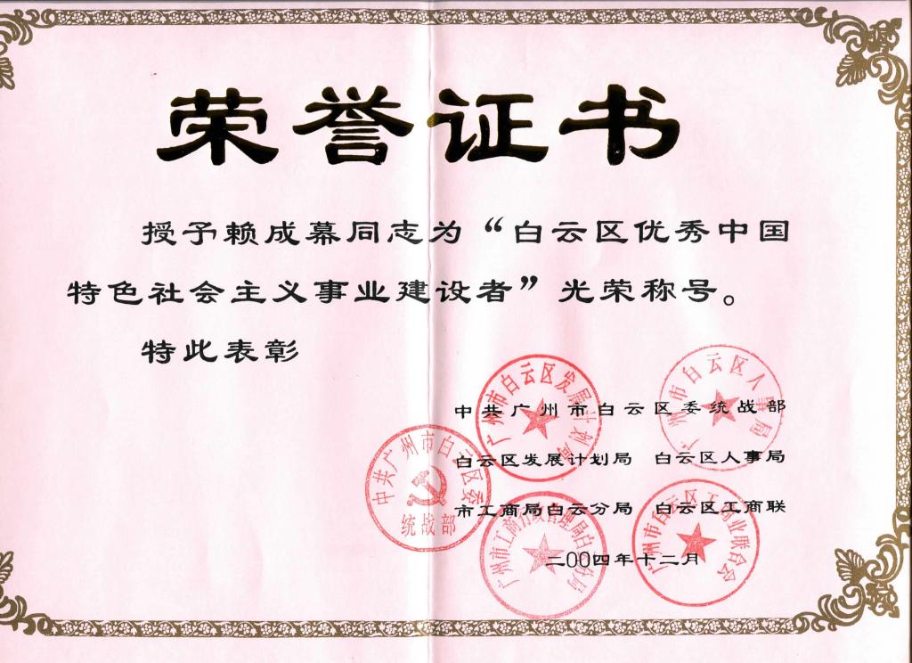赖成幕先生获“白云区优秀中国特色社会主义事业建设者”荣誉称号