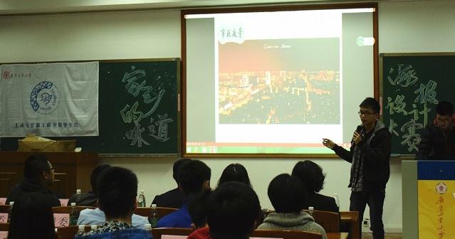 伴随着本次海报设计大赛宣传片的播放,决赛正式开始。电子版组和手绘版组的选手们依次上台向大家展示了作品,并对自己的家乡、作品的创意理念和设计思路进行了介绍和解读。选手们有的通过浓郁的色彩展示家乡独特的建筑魅力;有的以淡雅的水墨风格,描绘家乡美妙的小食;有的则以新颖创意的表现形式呈现出海报的设计制作过程。其中,林煜栩同学的作品《一城一味》以其创新的概念和插画手法的展现形式很好地诠释了“平平淡淡却终生难忘”的家乡味道;周嘉曦同学的作品《广州味道》在夜景小巷的背景中传递一种别样的羊城气息;而袁嘉倩同学则以巧妙的构图,在成长岁月的流逝中对比出了“旧建筑虽已不在,但家乡的味道不会逝去”的情怀。参赛选手们一个个精彩的展示,为现场观众献上了一场精彩绝伦的视觉盛宴。