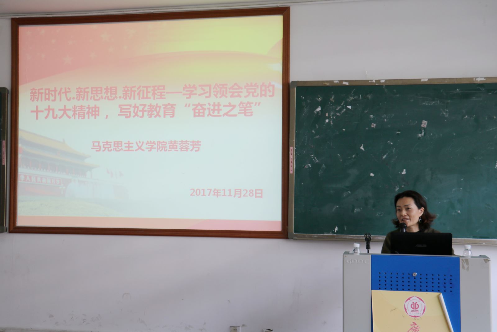 11月28日下午1:30,bw必威西汉姆联官方网站在工三208会议室举办学习党的十九大精神专题辅导报告会,邀请马克思主义学院黄蓉芳教授作题为《新时代·新思想·新征程——学习领会党的十九大精神,写好教育“奋进之笔”》的报告。会议由学院党委林军书记主持,全体教职工参加了会议。