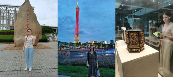 左:Anna Kotelnikova博士与校门合影;中:Anna Kotelnikova博士夜游广州塔;右:Anna Kotelnikova博士参观广东省博物馆