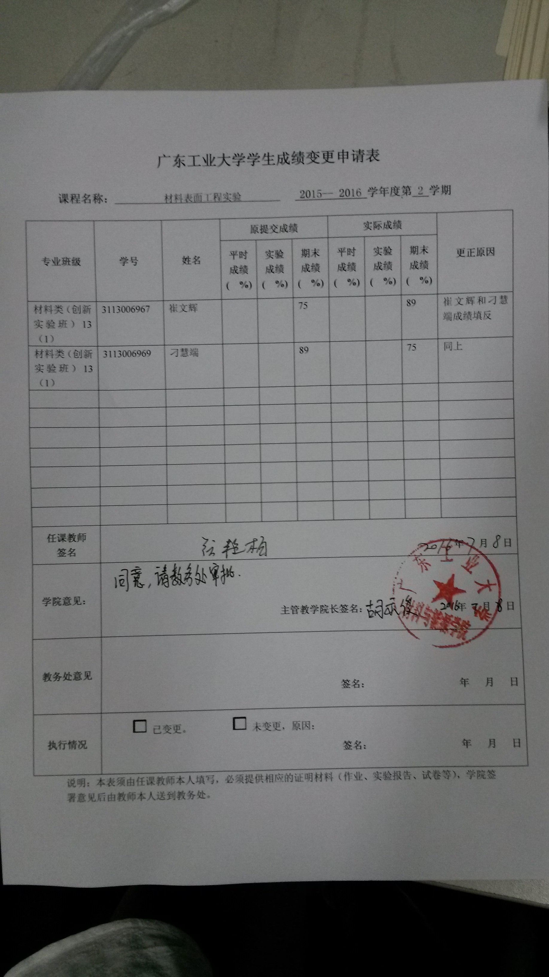 根据《广东工业大学理论课程考核管理办法》(广工大教字【2007】15号)文件之相关规定,现就《材料表面工程实验》课程(2015-2016-2学期)的学生成绩变更事项予以公示。 公示时间:2016年7月8日至2016年7月12日 如有异议,请署名书面反映到学院教务办公室,不接受匿名投诉。 电话:39322571