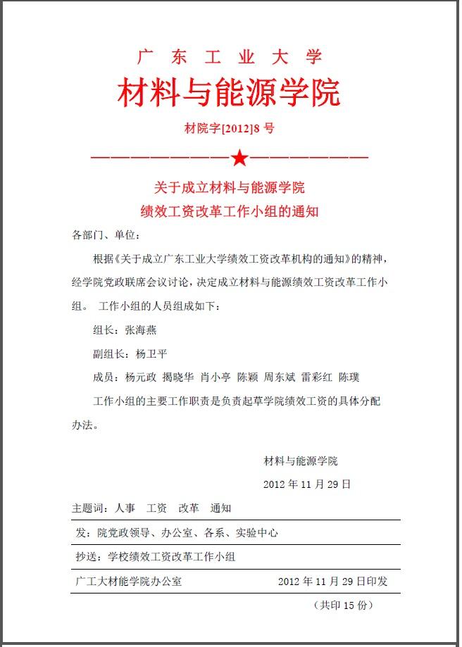 院字12年8号(关于成立材与能源学院绩效工资改革工作小组的通知)