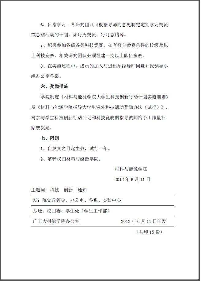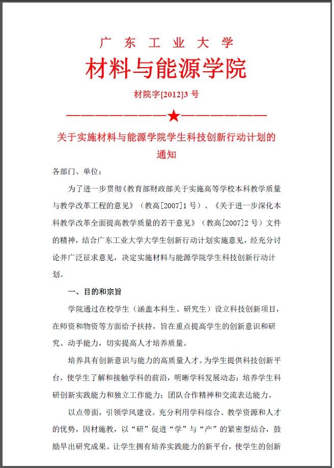 院字12年3号(关于实施材料与能源学院学生科技创新行动计划的通知)