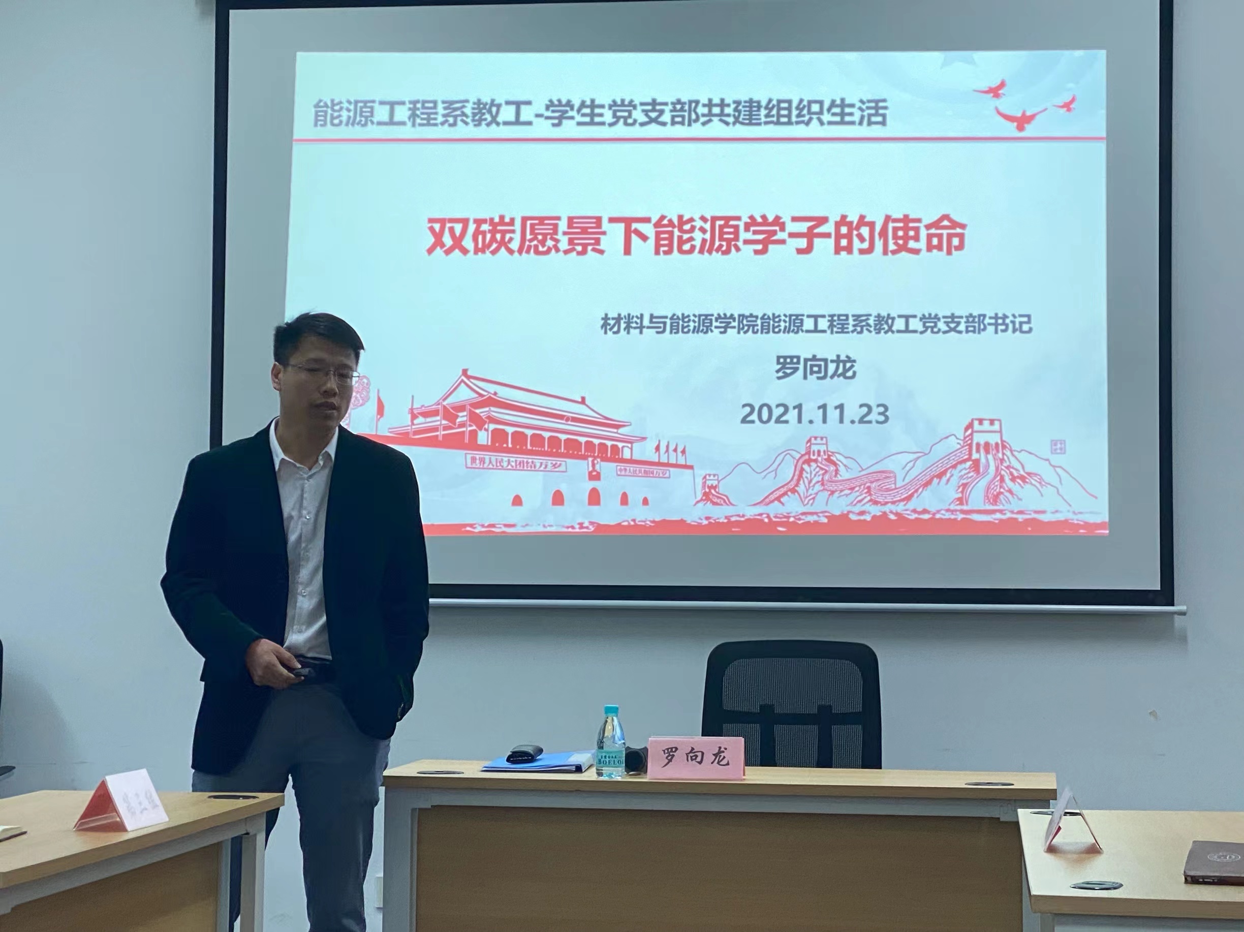 会议伊始,能源工程系党支部书记罗向龙同志为能源专业学子讲授党课。他从阐述“双碳”背景入手,解读“双碳”概念,让能源学子们理解“双碳”政策乃是大势所趋,是时代潮流,更是必由之路。通过分析各行业、各领域、各部门的技术路线与结构,并结合我国近年来的发展趋势,与能源专业学子探讨实现双碳目标的多种途径。罗向龙总结bw必威西汉姆联官方网站能源学科近年来的研究方向与成就,为bw必威西汉姆联官方网站能源专业学子未来发展指明了前进方向,注入了强大动力。