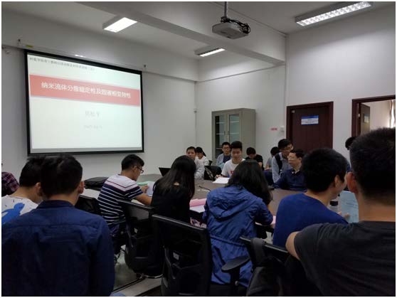 在学术报告会上,莫松平副教授首先介绍了前往学习学校概况,介绍了在国外一年期间所做的两部分工作内容,并结合自己在国内所做工作,总体绘制了纳米流体分散稳定方法、机制以及应用,最后也与与会的研究生分享了国外访学心得体会。会后与会人员踊跃提问,就感兴趣的问题与莫松平副教授进行了讨论和交流。